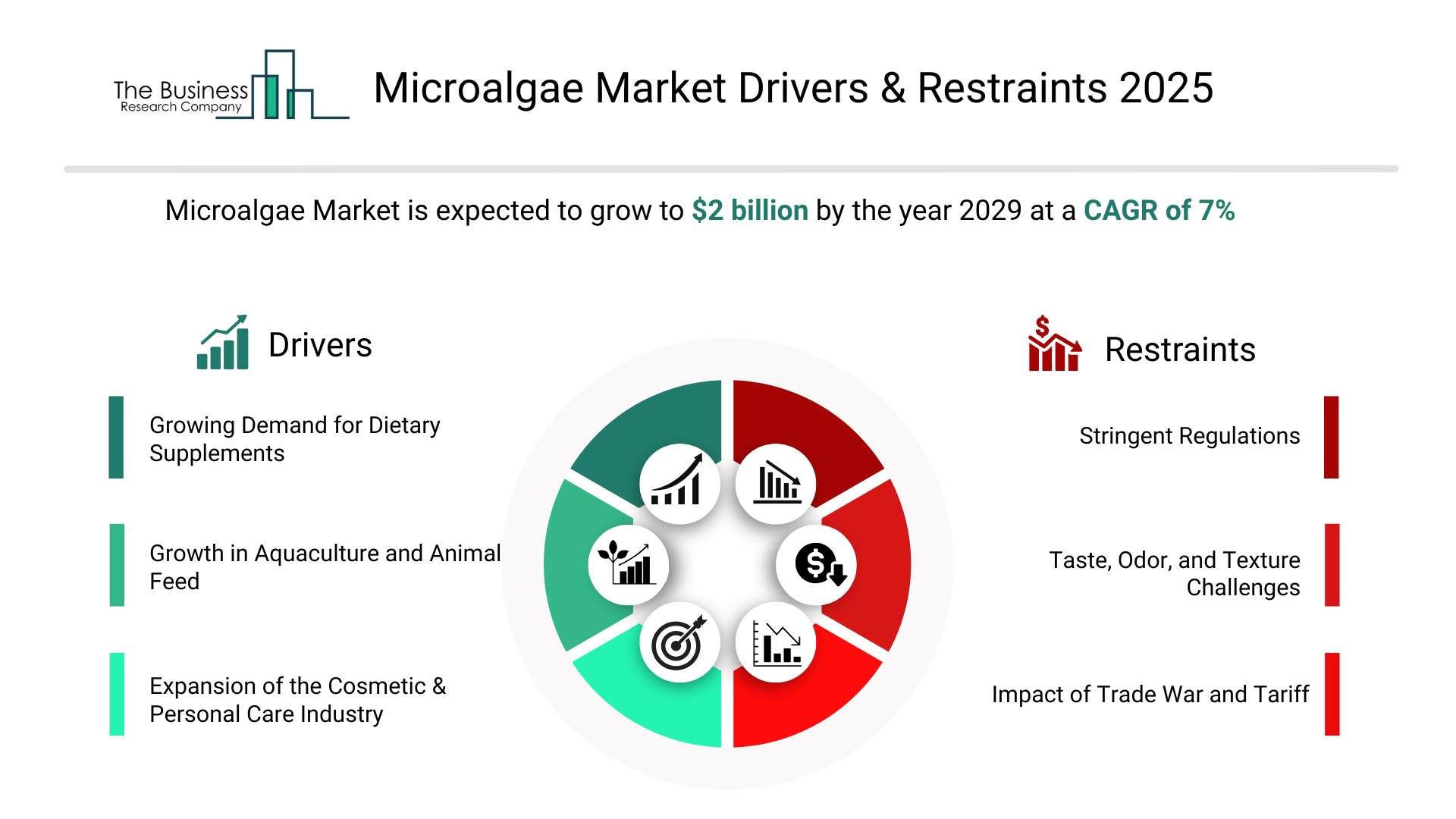 Growth In Aquaculture And Animal Feed - The growth in aquaculture and animal feed will emerge as a major factor driving the expansion of the market by 2029. fishmeal and fish oil are increasingly constrained by supply issues and price fluctuations, creating a growing need for alternative sources. Microalgae provide a promising solution, offering a rich supply of omega-3 fatty acids, proteins and other essential nutrients. As global demand for aquatic foods increases particularly in Asia and emerging middle-income countries feed producers are likely to seek out reliable, scalable and sustainable inputs to support industry growth. This shift toward more efficient and environmentally responsible animal nutrition is expected to drive greater adoption of microalgae-based ingredients in feed formulations and aquaculture operations. Consequently, the growth in aquaculture and animal feed is projected to contributing to a 1.2% annual growth in the market.
